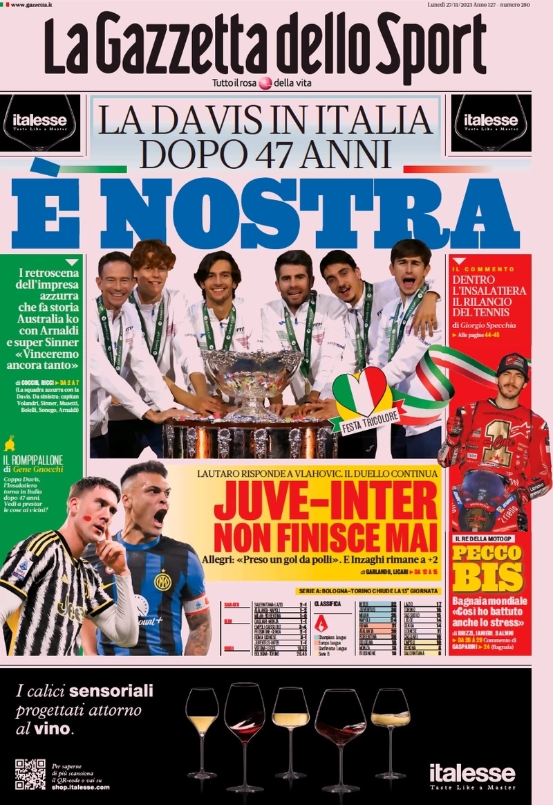 “È nostra”, questo è il titolo della prima pagina de La Gazzetta dello Sport, dedicata alla vittoria della Coppa Davis da parte dell’Italia. Sul derby d’Italia: “Juve-Inter non finisce mai”.