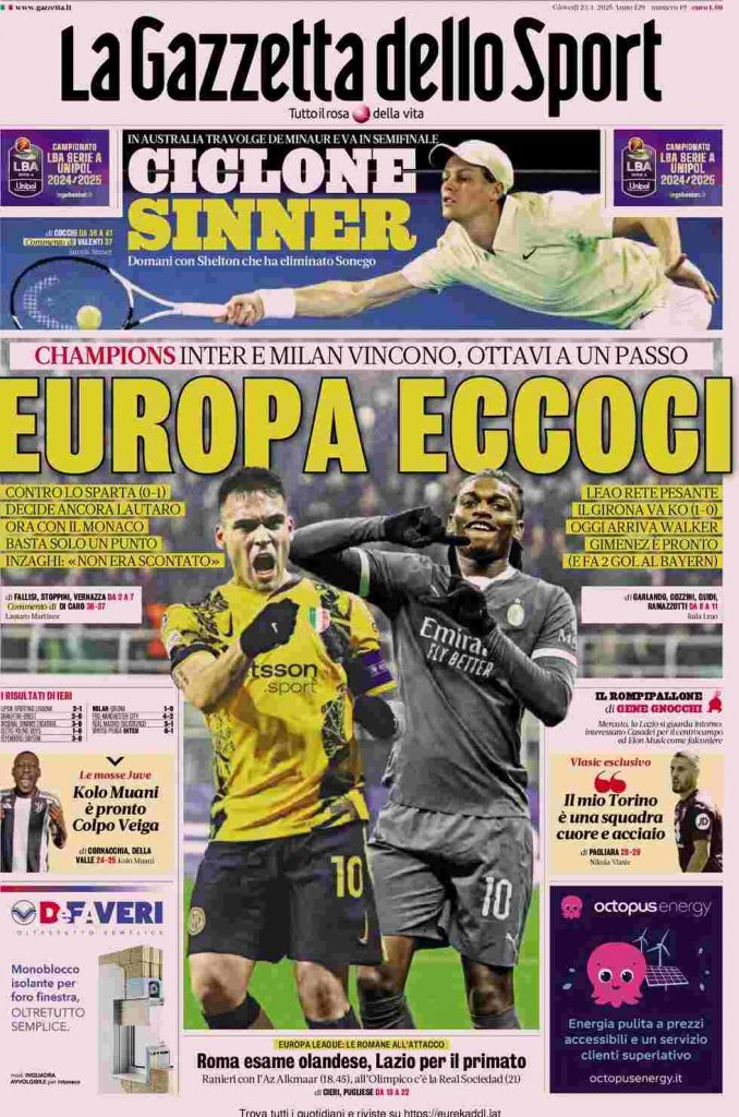 La Gazzetta dello Sport titola: “Europa eccoci. Champions, Inter e Milan vincono, ottavi a un passo”. In alto: “Ciclone Sinner”. In taglio basso: “Kolo Muani è pronto. Colpo Veiga”, “Vlasic esclusivo: Il mio Torino è una squadra di cuore e acciaio” e “Roma esame olandese, Lazio per il primato”.