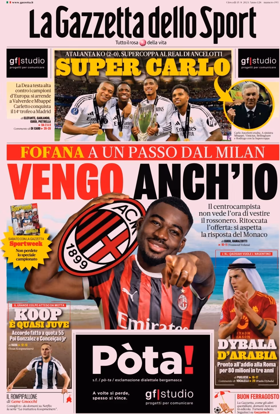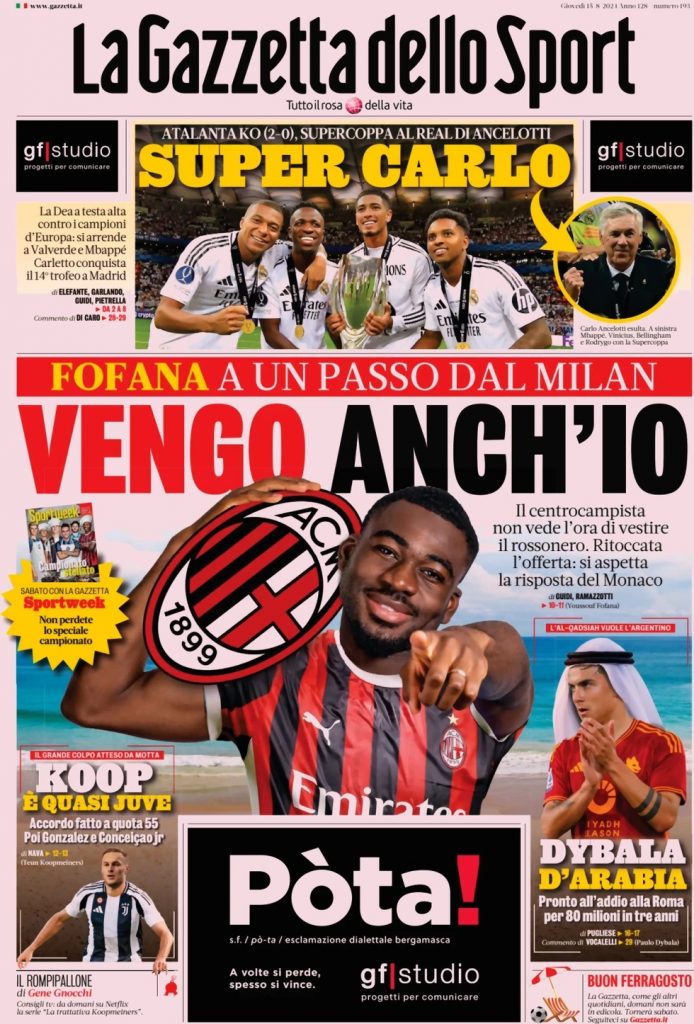La Gazzetta dello Sport apre con il mercato del Milan: “Vengo anch’io”. In alto: “Super Carlo”. In taglio basso: “Koop è quasi Juve” e “Dybala d’Arabia“.