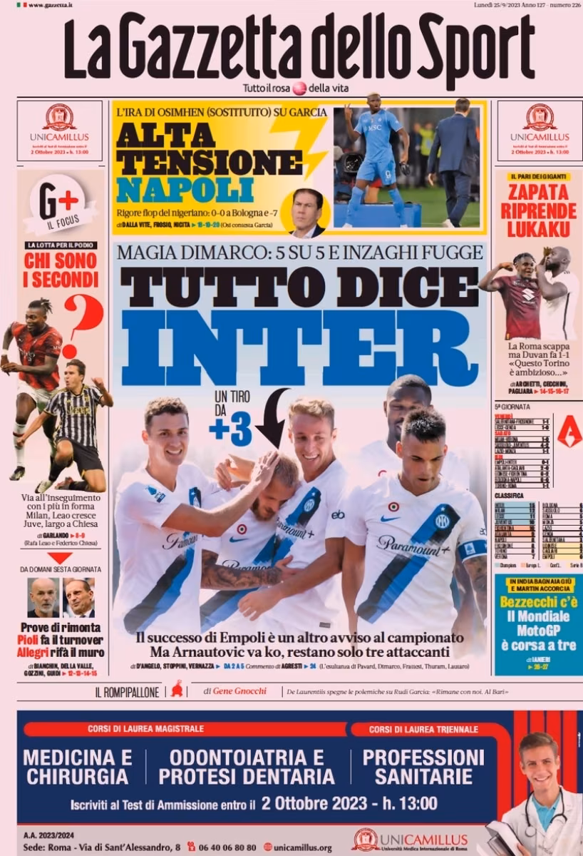 La Gazzetta dello Sport apre con la vittoria dell’Inter sull’Empoli: “Tutto dice Inter. Magia Dimarco: 5 su 5 e Inzaghi fugge”. A lato spazio però anche alla Juve: “Chi sono i secondi? Prove di rimonta, Pioli fa turnover, Allegri rifà il muro”.