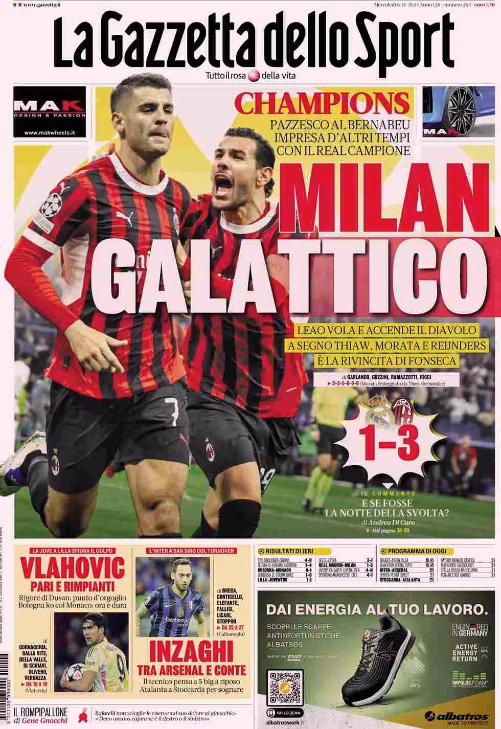 La Gazzetta dello Sport apre con la grande vittoria della squadra di Fonseca al Bernabeu contro il Real Madrid: “Milan galattico”. E ancora: “Leao vola e accende il Diavolo. A segno Thiaw, Morata e Reijnders. È la rivincita di Fonseca”. In taglio basso: “Vlahovic, pari e rimpianti. Rigore di Dusan: punto d’orgoglio. Bologna ko col Monaco: ora è dura” e “Inzaghi tra Arsenal e Conte”.