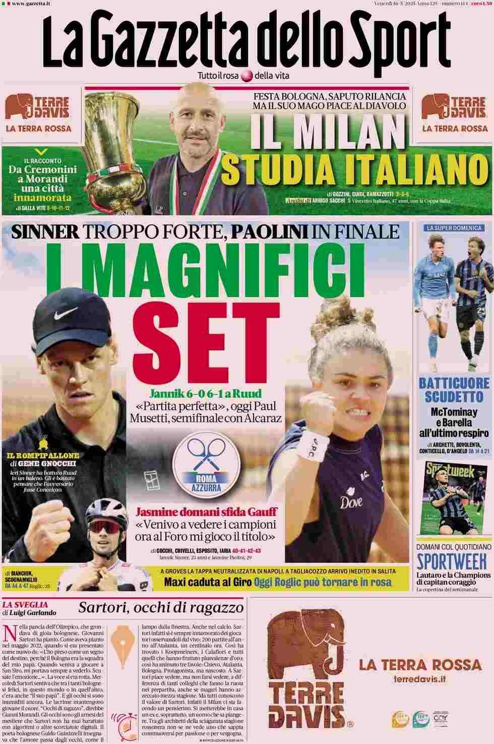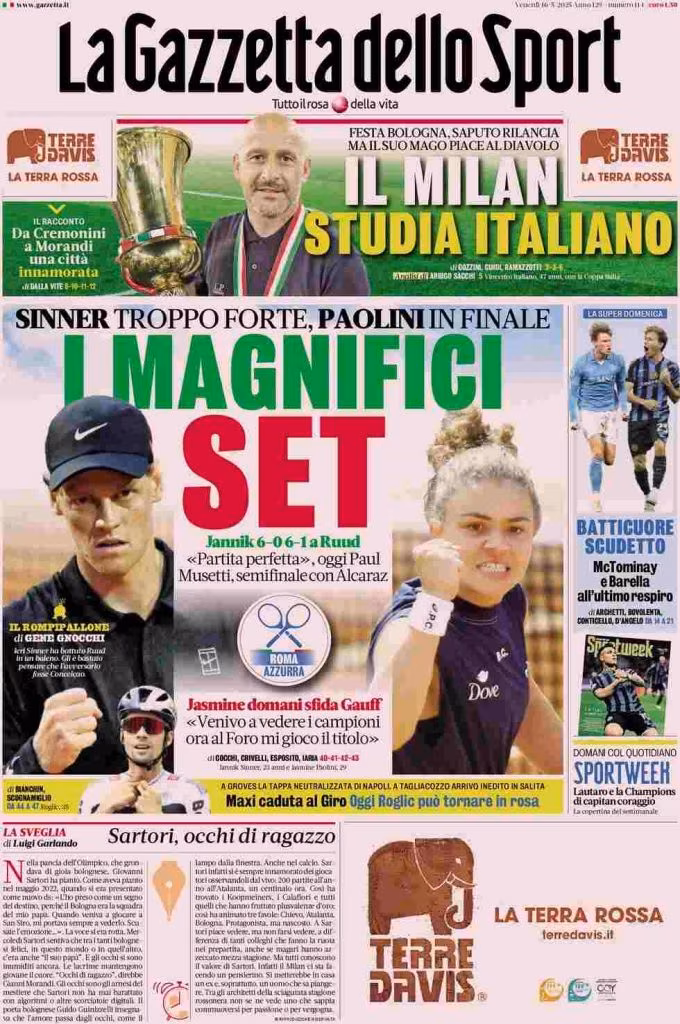 La Gazzetta dello Sport apre con il tennis: “I magnifici set. Sinner troppo forte, Paolini in finale”. In taglio alto: “Il Milan studia Italiano”. A lato: “Batticuore scudetto. McTominay e Barella all’ultimo respiro”. In basso: “Jasmine domani sfida Gauff” e “Maxi caduta al Giro. Oggi Roglic può tornare in rosa”.