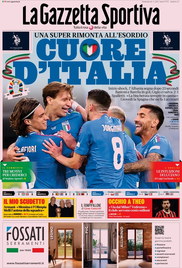La prima pagina della rosea è dedicata alla rimonta azzurra della Nazionale italiana agli Europei. La squadra di Spalletti, sotto dopo appena un minuto con l’Albania, è riuscita nella rimonta in pochi minuti grazie ai gol di Bastoni e Barella. Nell’articolo di fondo invece si parla di calciomercato, con Theo Hernandez che spaventerebbe il Milan in conferenza stampa con le sue parole sul futuro.