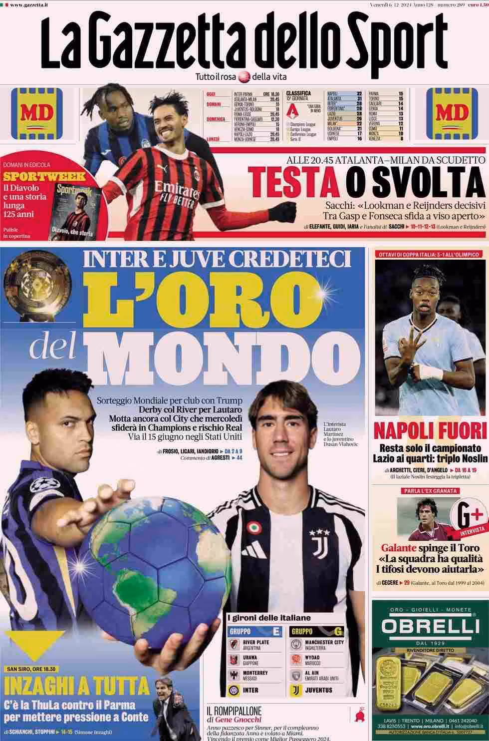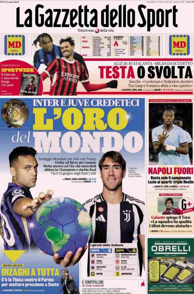 La Gazzetta dello Sport apre con il Mondiale per Club: “L’oro del mondo. Inter e Juve credeteci”. In taglio alto spazio al Milan: “Testa o svolta”. A lato: “Napoli fuori. Resta solo il campionato. Lazio ai quarti: triplo Noslin” e “Galante spinge il Toro: La squadra ha qualità. I tifosi devono aiutarla”. In basso: “Inzaghi a tutta. C’è la ThuLa contro il Parma per mettere pressione a Conte”.
