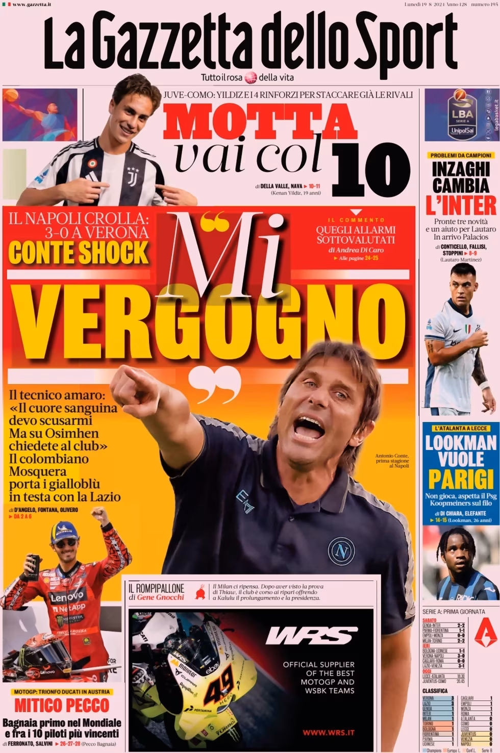 La Gazzetta dello Sport apre con le parole di Conte: “Mi vergogno”. In taglio alto: “Motta vai col 10″. A lato: “Inzaghi cambia l’Inter” e “Looman vuole Parigi”.