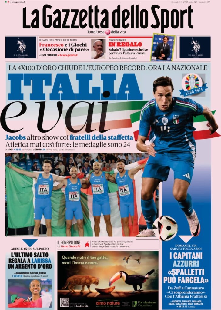La Gazzetta dello Sport titola: “Italia e vai”. A lato su Euro2024: “I capitani azzurri: Spalletti può farcela”. In basso: “L’ultimo salto regala a Larissa un argento d’oro”.
