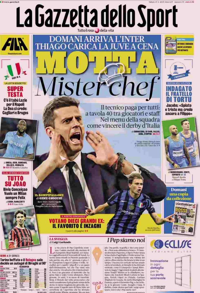 La Gazzetta dello Sport titola: “Motta Misterchef”. E ancora: “Domani arriva l’Inter. Thiago carica la Juve a cena. Il tecnico paga per tutti: a tavola 40 tra giocatori e staff. Nel menù della squadra come vincere il derby d’Italia”. A lato: “Super testa”, “Tutto su Joao”, “Indagato il fratello di Tortu” e “Torino beffato e il Bologna sale. Decide un autogol di Biraghi al 90′”. In basso: “Votano dieci grandi ex: il favorito è Inzaghi”.