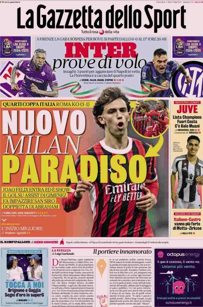 La Gazzetta dello Sport apre con i rossoneri: “Nuovo Milan paradiso”. E ancora: “Joao Felix entra ed è show. Il gol su assist di Gimenez fa impazzire San Siro. Doppietta Abraham”. In taglio alto: “Inter, prove di volo”. A lato: “Juve. Lista Champions. Fuori Costa. C’è Kolo Muani” e “Italiano-Castro vanno più forte di Motta-Zirkzee”. In taglio basso: “Tocca a noi. Brignone e Goggia. Sogni d’oro in superG”.