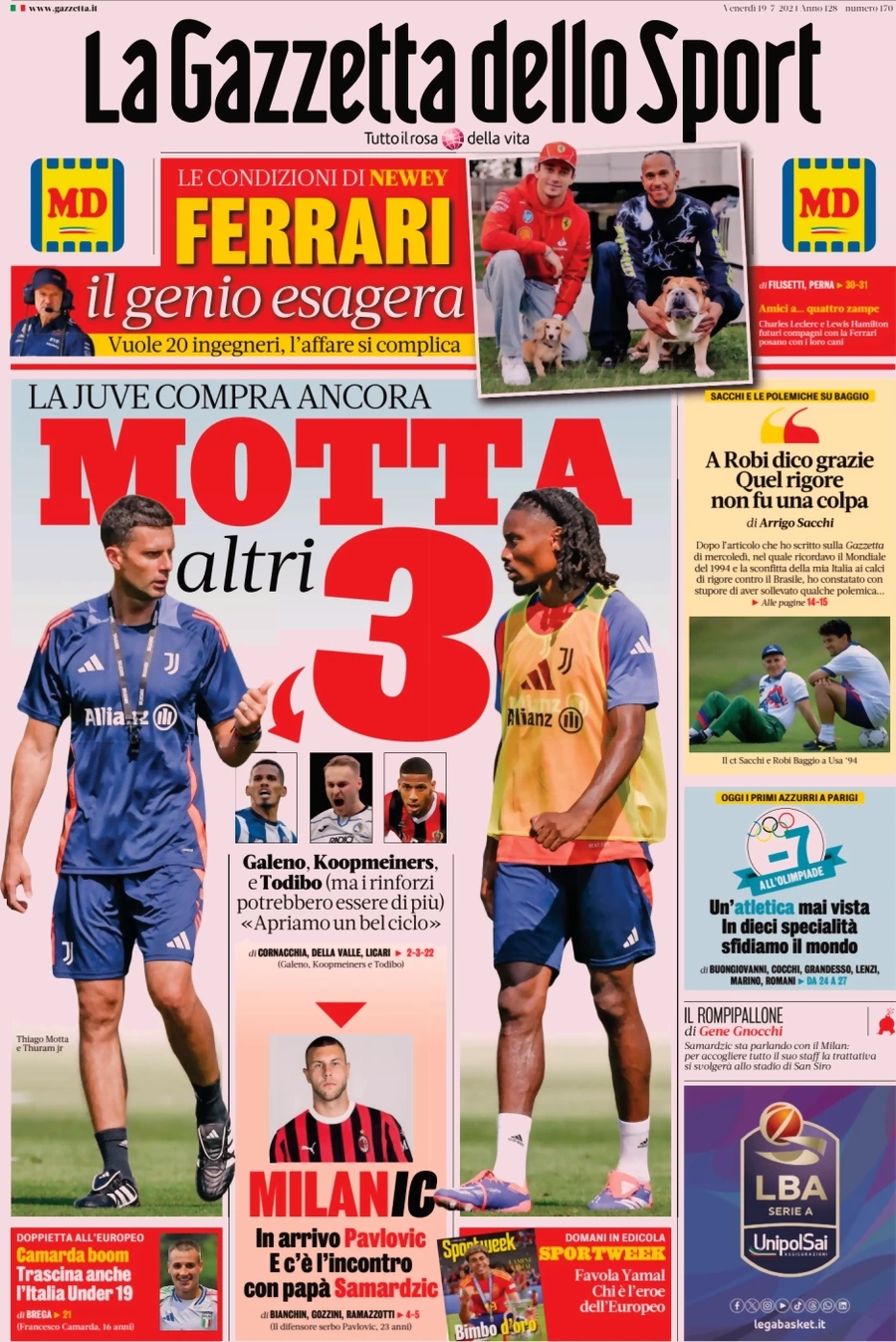 La Gazzetta dello Sport apre con il mercato della Juve: “Motta, altri 3″. E ancora: “Galeno, Koopmeiners e Todibo (ma i rinforzi potrebbero essere di più)”. In taglio basso: “MilanIc”, “Camarda boom”. A lato: “A Robi dico grazie, quel rigore non fu una colpa”.