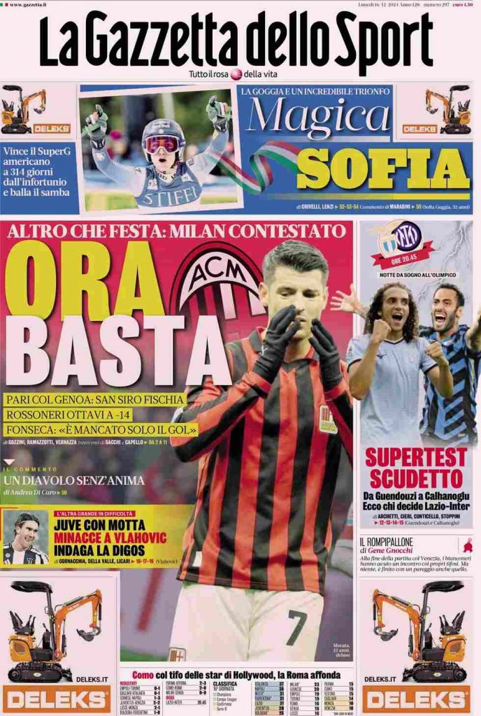 La Gazzetta dello Sport apre con il deludente pareggio del Milan contro il Genoa: “Ora basta. Altro che festa: Milan contestato”. In taglio alto: “Magica Sofia”. A lato: “Supertest scudetto. Da Guendouzi a Calhanoglu. Ecco chi decide Lazio-Inter”. In basso: “Juve con Motta: minacce a Vlahovic. indaga la Digos” e “Como col tifo delle star di Hollywood, la Roma affonda”.