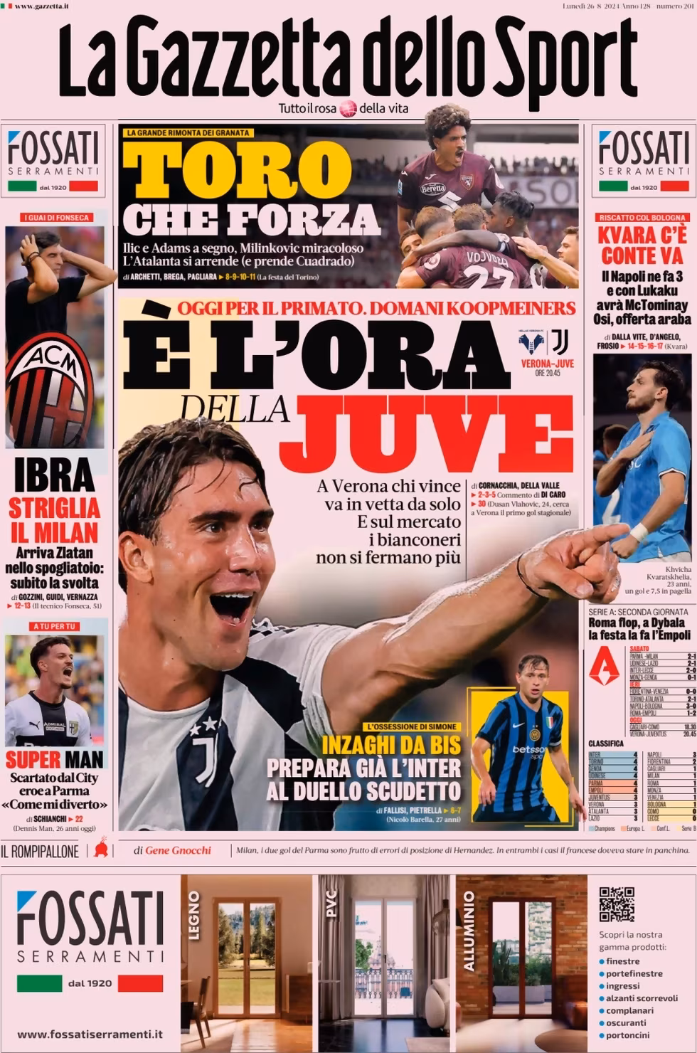 “È l’ora della Juve“, questo il titolo de La Gazzetta dello Sport. In taglio alto: “Toro che forza”. A lato: “Ibra striglia il Milan”, “Super Man” e “Kvara c’è, Conte va”. In basso: “Inzaghi da bis. Prepara già l’Inter al duello scudetto”.