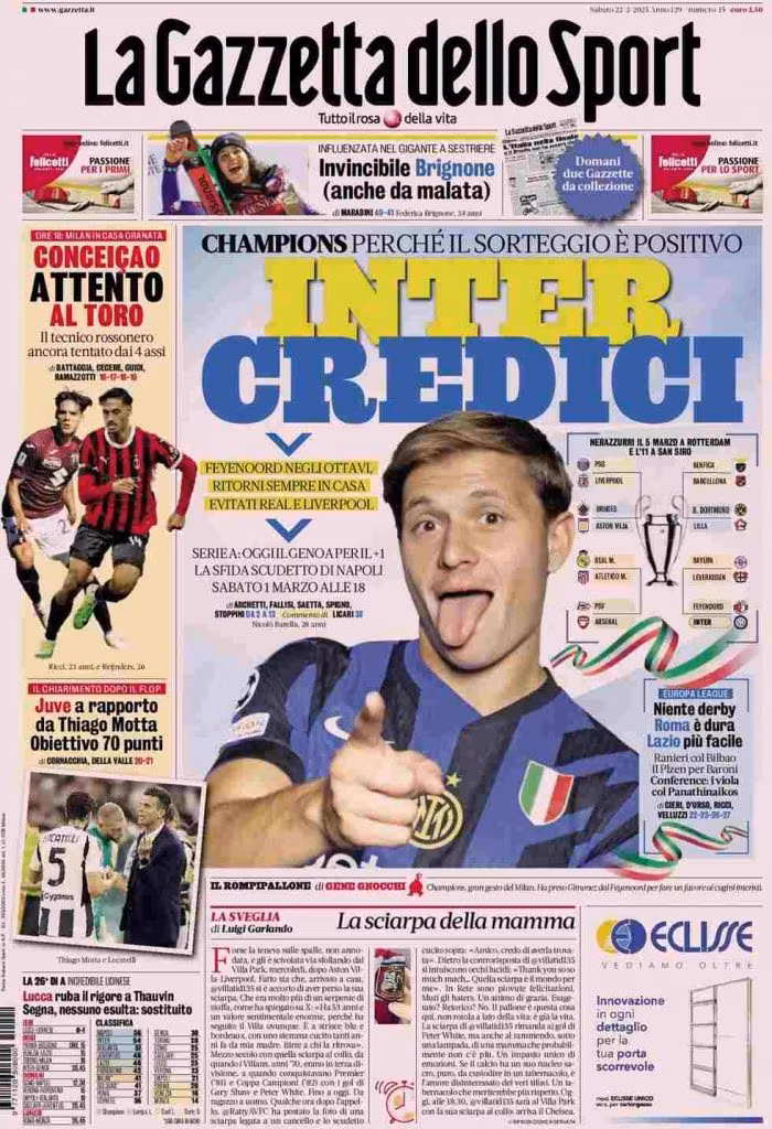 La Gazzetta dello Sport apre con la squadra di Inzaghi: “Inter credici. Champions, perchè il sorteggio è positivo”. In alto: “Invincibile Bignone (anche da malata)”. A lato: “Conceicao attento al Toro” e “Juve a rapporto da Thiago Motta. Obiettivo 70 punti”. In basso: “Niente derby. Roma è dura. Lazio più facile” e “Lucca ruba il rigore a Thauvin. Segna, nessuno esulta: sostituito”.