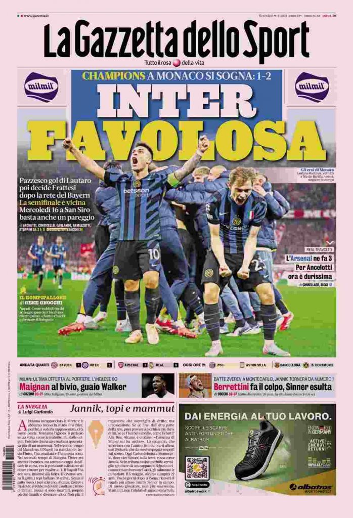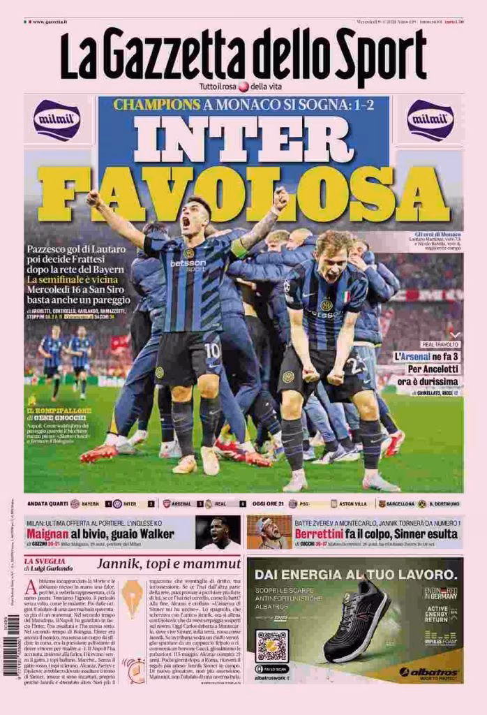 La Gazzetta dello Sport apre con la grande vittoria nerazzurra in Champions: “Inter favolosa”. E ancora: “Pazzesco gol di Lautaro poi decide Frattesi dopo la rete del Bayern. La semifinale è vicina. Mercoledì 16 a San Siro basta anche un pareggio”. A lato: “L’Arsenal ne fa 3. Per Ancelotti ora è durissima”. In basso: “Maignan al bivio, guaio Walker” e “Berrettini fa il colpo, Sinner esulta”.