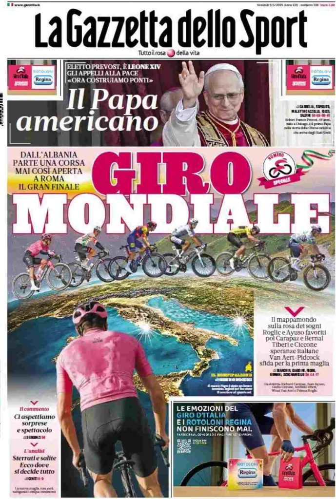 La Gazzetta dello Sport titola: “Giro mondiale”. E poi ancora: “Il mappamondo sulla rosa dei sogni. Roglic e Ayuso favoriti poi Carapaz e Bernal. Tibert e Ciccone speranze italiane. Van Aert-Pidcock sfida per la prima maglia”, “Ci aspettiamo sorprese e spettacolo” e “Sterrati e salite. Ecco dove si decide tutto”. In alto: “Il Papa americano”.