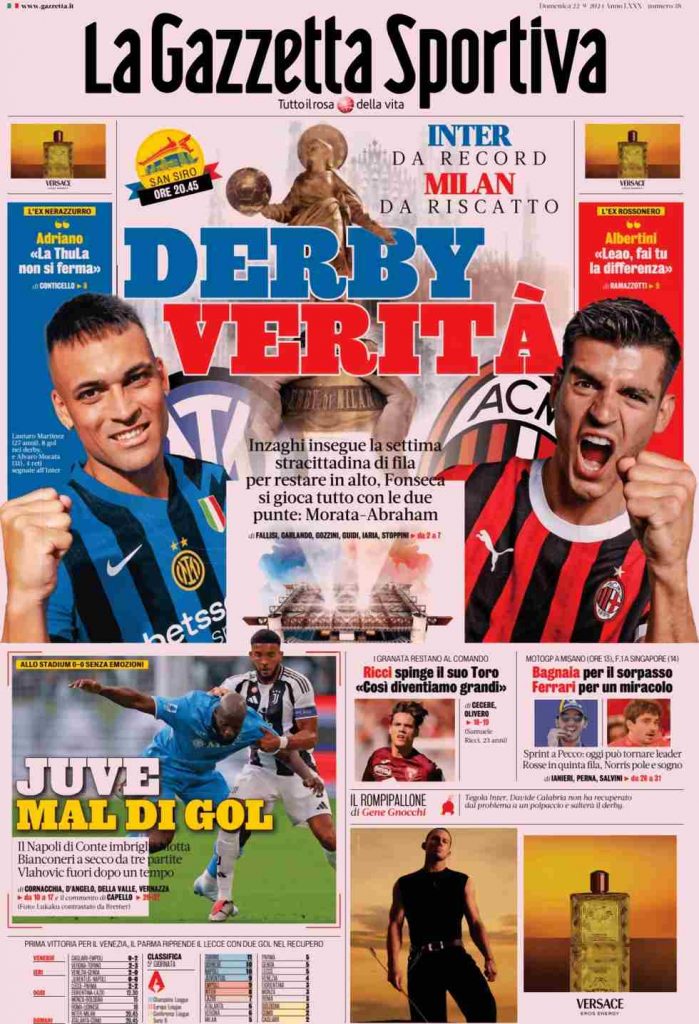 La Gazzetta dello Sport titola: “Derby verità. Inter da record. Milan da riscatto”. A lato le interviste a due grandi ex: “Adriano: La ThuLa non si ferma” e “Albertini: Leao, fai tu la differenza”. In taglio basso: “Juve mal di gol“, “Ricci spinge il suo Toro: così diventiamo grandi” e “Bagnaia per il sorpasso. Ferrari per il miracolo”.