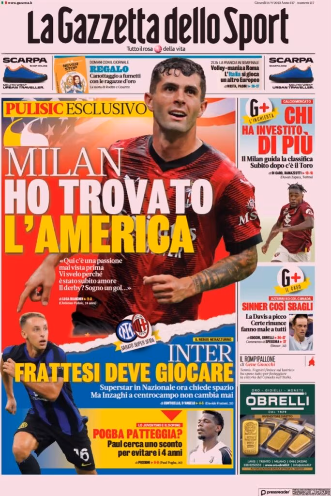 “Milan, ho ritrovato l’America”, questo il titolo della prima pagina de La Gazzetta dello Sport, che apre con un’intervista esclusiva a Pulisic. In taglio basso spazio anche all’Inter: “Inter, Frattesi deve giocare”. E alla Juve: “Pogba patteggia? Paul cerca uno sconto per evitare i 4 anni“.