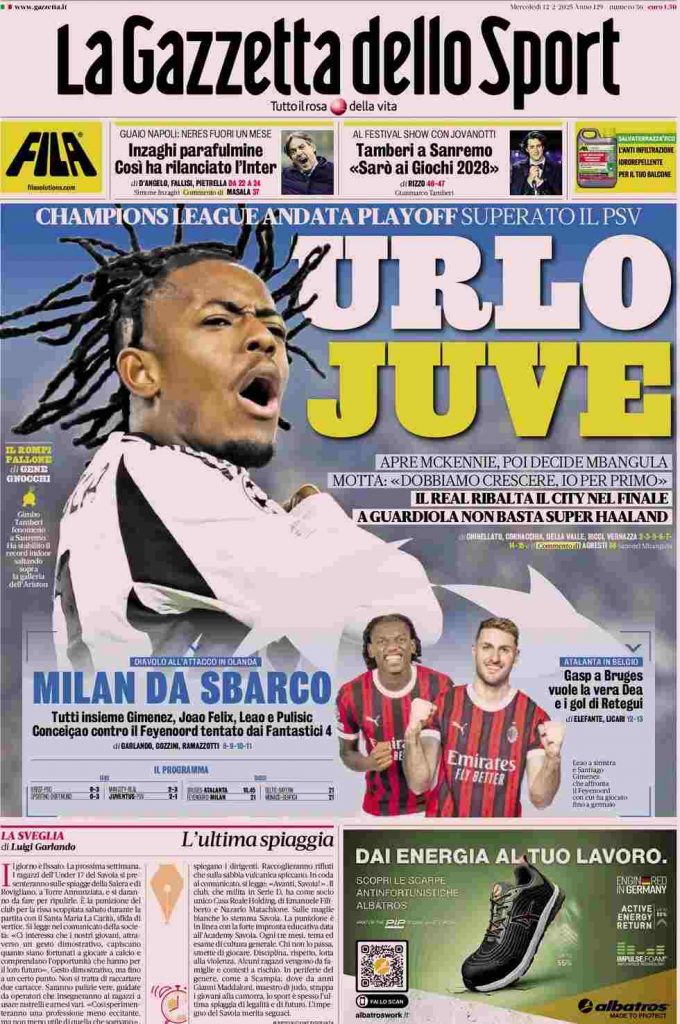 La Gazzetta dello Sport apre con la vittoria della squadra di Motta: “Urlo Juve”. E ancora: “Champions League andata playoff, superato il PSV”. In alto: “Inzaghi parafulmine. Così ha rilanciato l’Inter” e “Tamberi a Sanremo: Sarò ai Giochi 2028”. In basso: “Milan da sbarco”, “Gasp a Bruges vuole la vera Dea e i gol di Retegui” e “L’ultima spiaggia”.