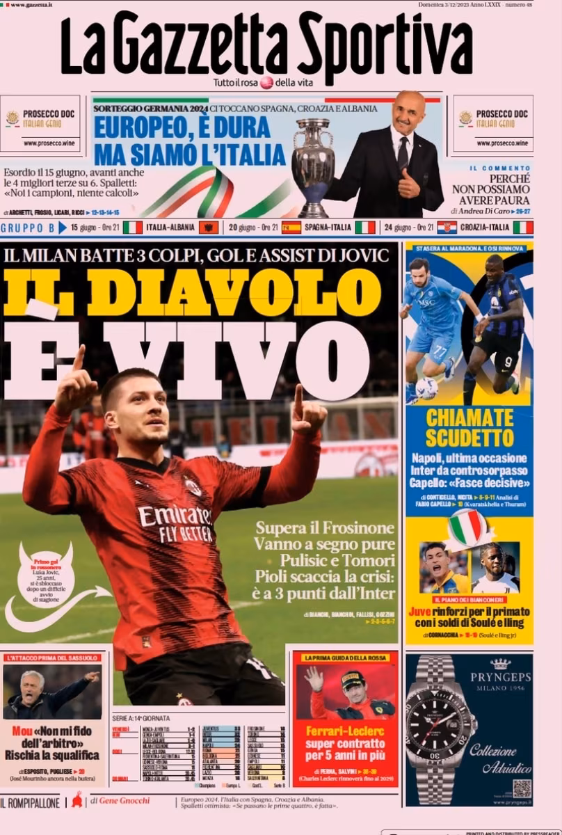 La Gazzetta dello Sport dedica la sua prima pagina al Milan: “Il Diavolo è vivo”. A lato spazio al match tra Napoli e Inter: “Chiamate scudetto”. Sui bianconeri: “Juve, rinforzi per il primato con i soldi di Soulè e Iling”.