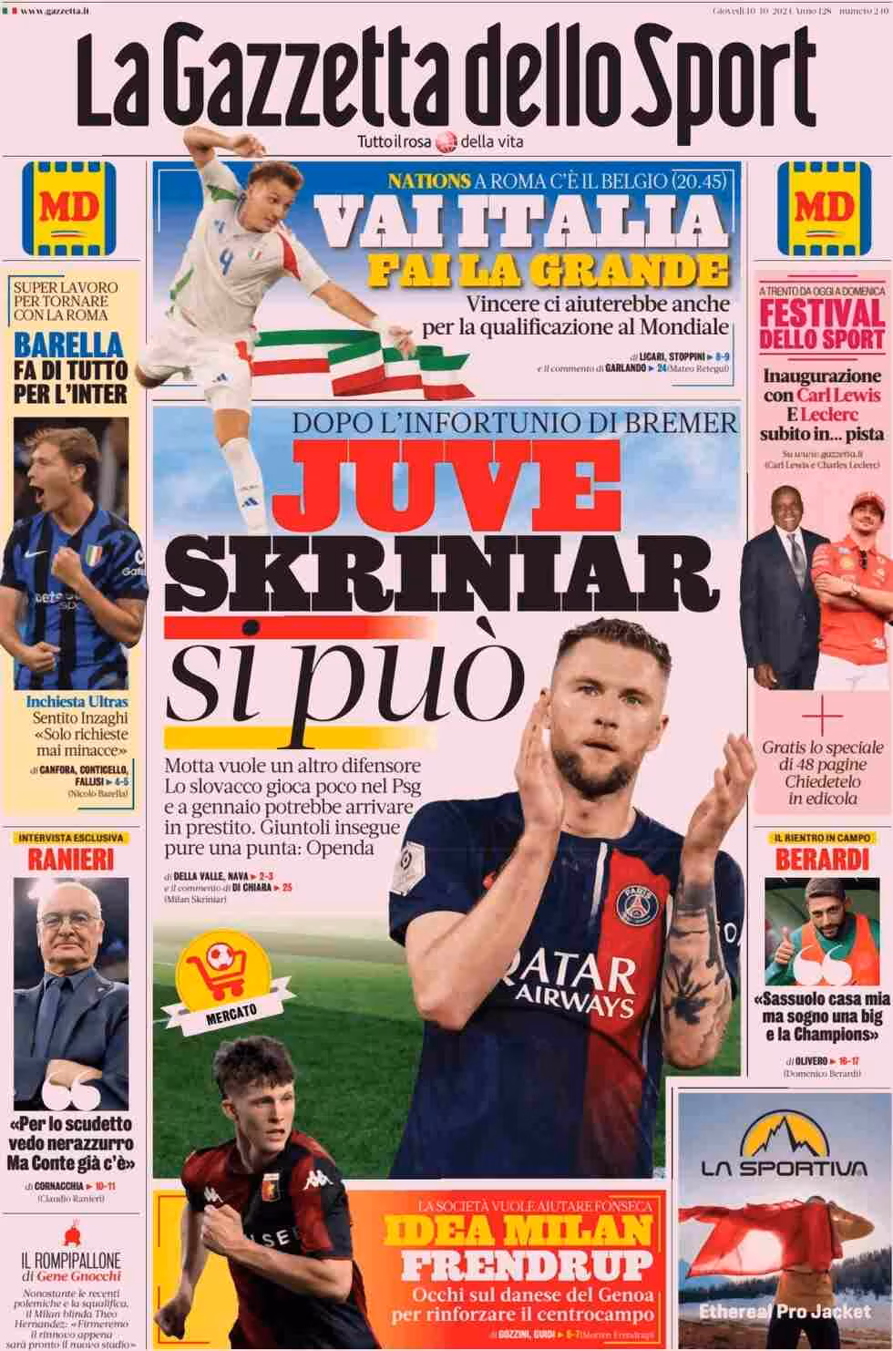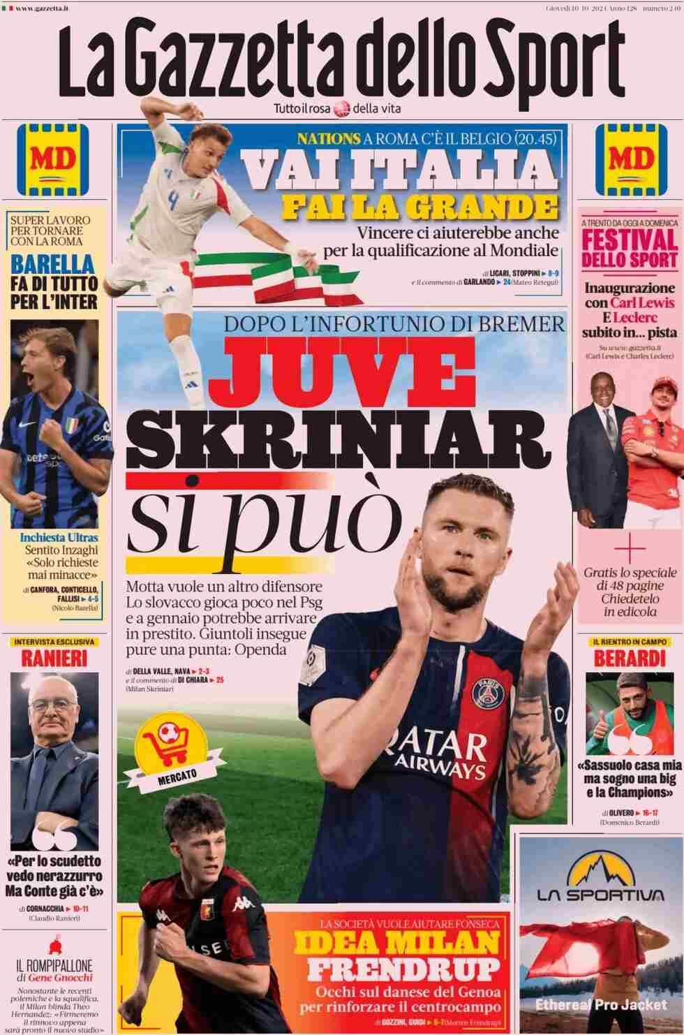 La Gazzetta dello Sport titola: “Juve, Skriniar si può”. E ancora: “Motta vuole un altro difensore. Lo slovacco gioca poco nel PSG e a gennaio potrebbe arrivare in prestito. Giuntoli insegue pure una punta: Openda”. In taglio alto: “Vai Italia, fai la grande”. A lato: “Barella fa di tutto per l’Inter”, “Ranieri: Per lo scudetto vedo nerazzurro. Ma Conte già c’è”, “Festival dello Sport. Inaugurazione con Carl Lewis. E Leclerc subito in… pista” e “Berardi: Sassuolo casa mia ma sogno una big e la Champions”. In taglio basso: “Idea Milan Frendrup”.