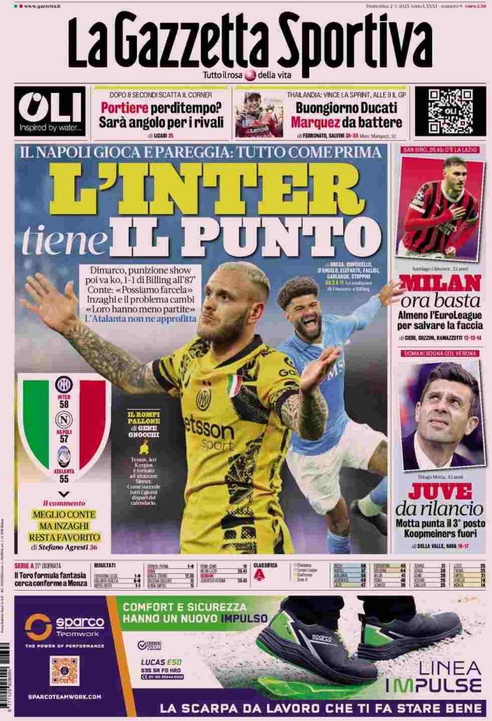 La Gazzetta dello Sport titola: “L’Inter tiene il punto”. E ancora: “Il Napoli gioca e pareggia: tutto come prima”. In alto: “Portiere perditempo? Sarà angolo per gli avversari” e “Buongiorno Ducati, Marquez da battere”. A lato: “Milan, ora basta. Almeno l’EuroLeague per salvare la faccia” e “Juve da rilancio. Motta punta il 3o posto. Koopmeiners fuori“. In basso: “Il Toro formula fantasia cerca conferme a Monza”.