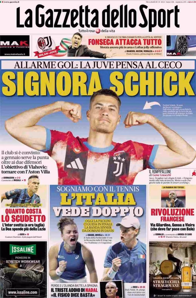 La Gazzetta dello Sport titola: “Signora Schick. Allarme gol: la Juve pensa al ceco”. Sotto: “Quanto costa lo scudetto. L’Inter svetta (e ora taglia). La Dea spende più della Lazio” e “Rivoluzione francese. Via Gilardino, Genoa a Vieira (che deve far pace con Balo)”. In taglio alto: “Fonseca attacca tutto”. In basso spazio al tennis: “L’Italia vede doppio” e “Il triste addio di Nada: Il fisico dice basta”.