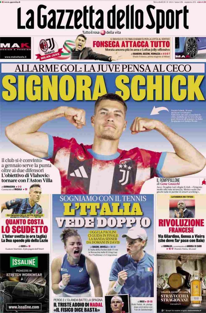 Il Corriere dello Sport apre con i bianconeri: “Sulle spalle di Yildiz”. E ancora: “Vlahovic fuori: il turco e Weah alla prova del 9“. A lato: “Il calcio è uno, troppe fantasie”. In basso: “McTominay che regalo!”, “Ranieri, i rebus della Roma”, “Il Genoa chiama Vieira”, “Ho rilanciato l’Inter, Dimarco il mio idolo” e “Italia, la prima coppa e poi palla a Sinner”.