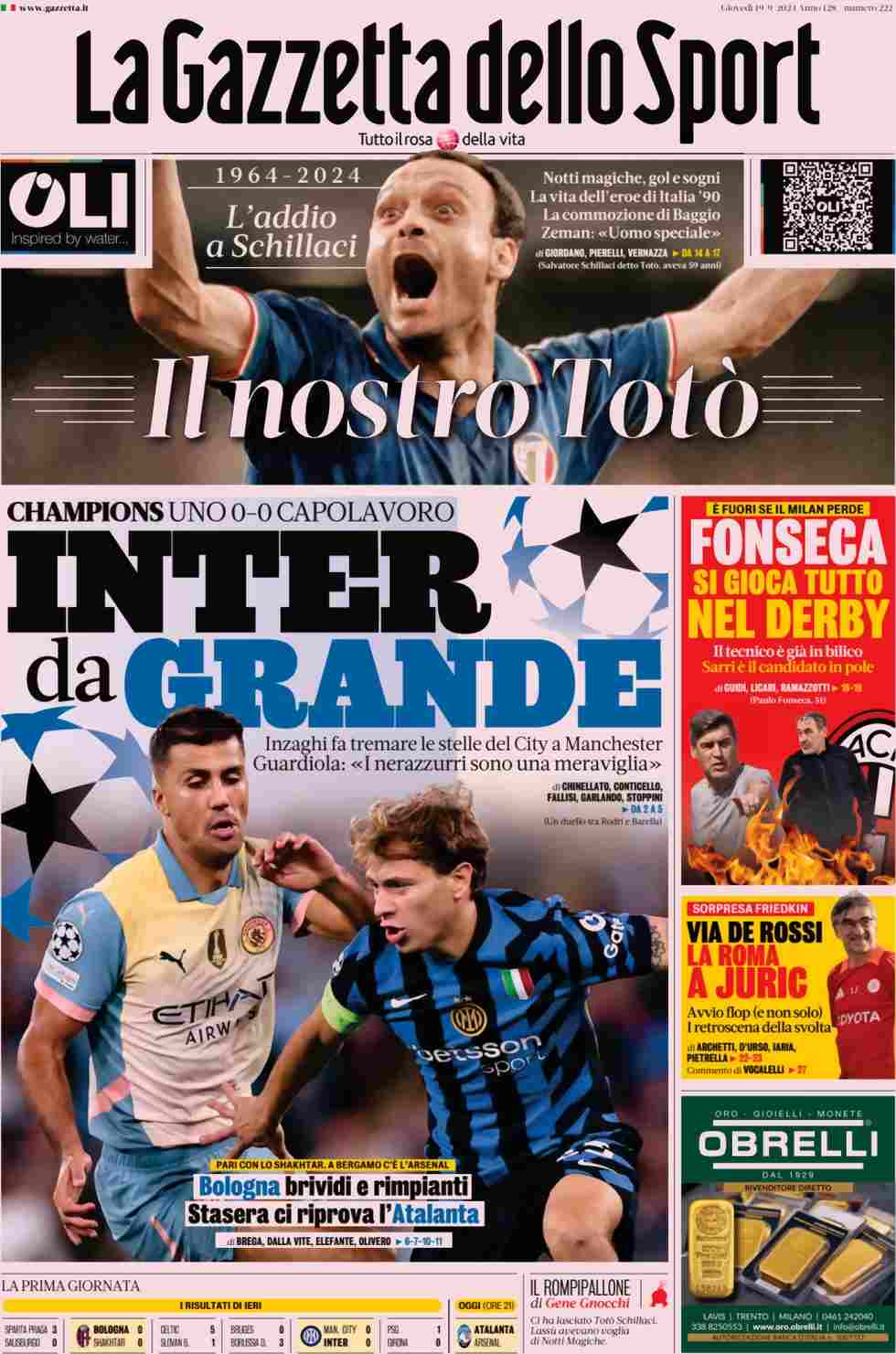 La Gazzetta dello Sport apre con la prestazione in Champions dell’Inter contro il Manchester City: “Inter da grande”. In taglio basso: “Bologna brividi e rimpianti. Stasera ci riprova l’Atalanta”. In alto spazio allo scomparso Schillaci: “Il nostro Totò“. A lato: “Fonseca si gioca tutto nel derby” e “Via de Rossi. La Roma a Juric”