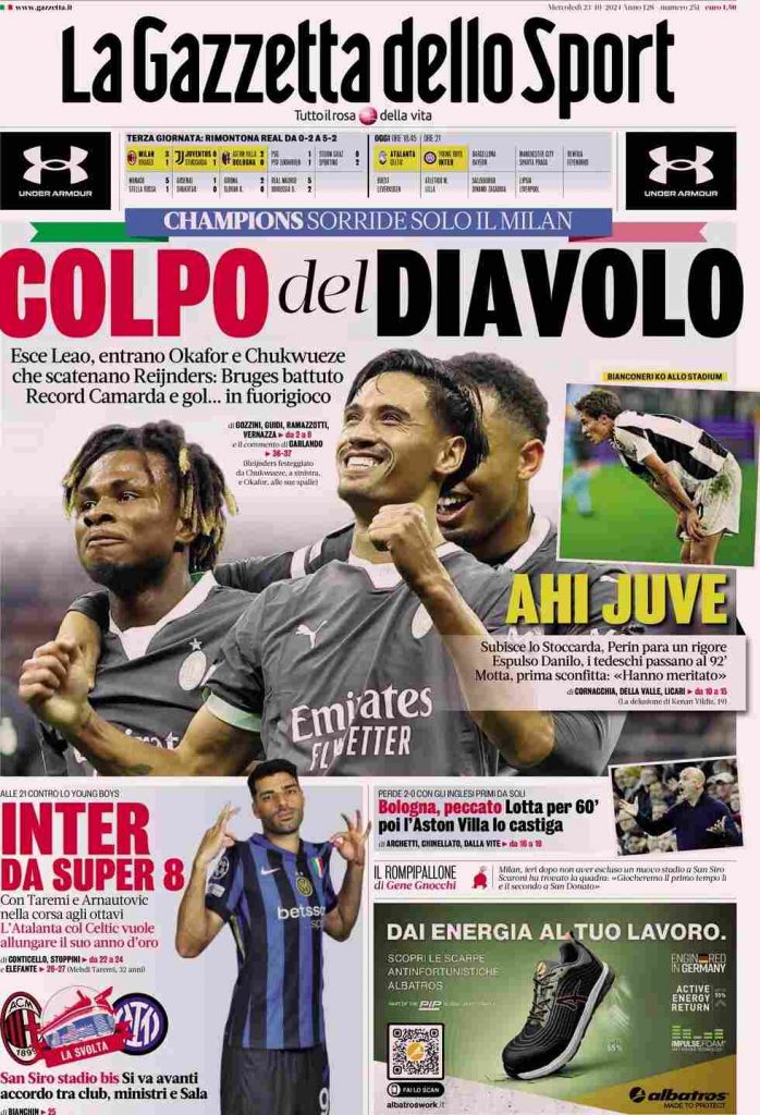 La Gazzetta dello Sport titola: “Colpo del Diavolo. Champions, sorride solo il Milan”. A lato: “Ahi Juve”. E ancora: “Subisce lo Stoccarda, Perin para un rigore. Espulso Danilo, i tedeschi passano al 92′. Motta, prima sconfitta: Hanno meritato“. In taglio basso: “Inter da super 8” e “Bologna, peccato. Lotta per 60′ poi l’Aston Villa lo castiga”.