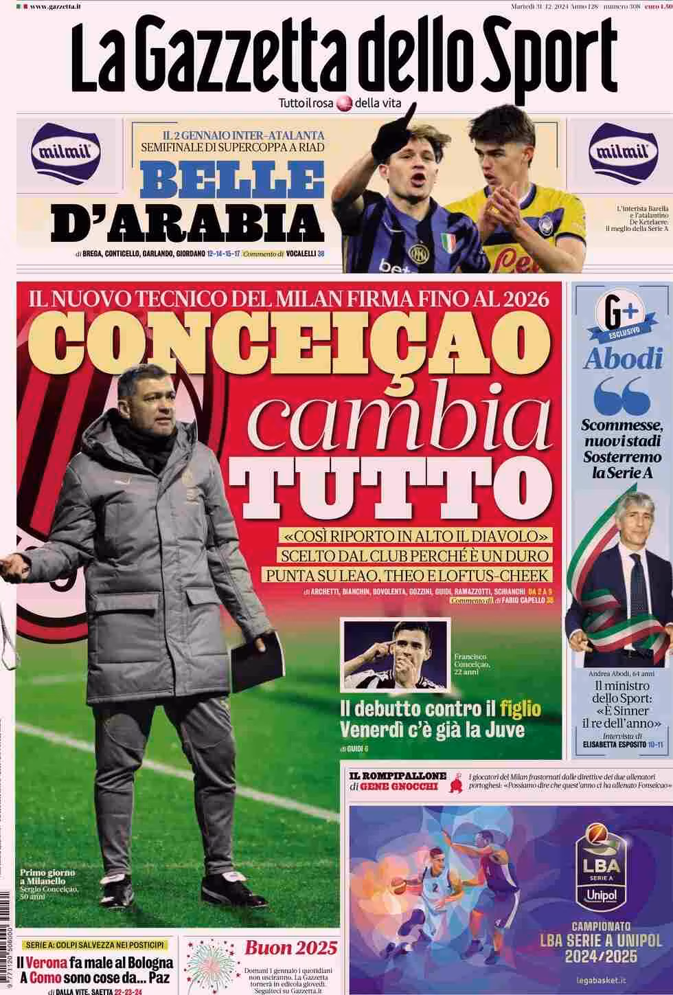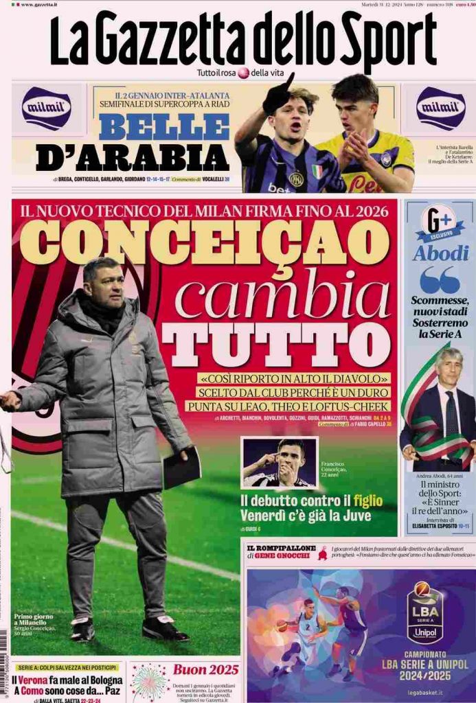 La Gazzetta dello Sport titola: “Conceicao cambia tutto“. E ancora: “Il nuovo tecnico del Milan firma fino al 2026”. Sotto: “Il debutto contro il figlio. Venerdì c’è già la Juve”. In alto: “Belle d’Arabia“. A lato: “Abodi: Scommesse nuovi stadi. Sosterremo la Serie A”. In taglio basso: “Il Verona fa male al Bologna. A Como sono cose da… Paz”.