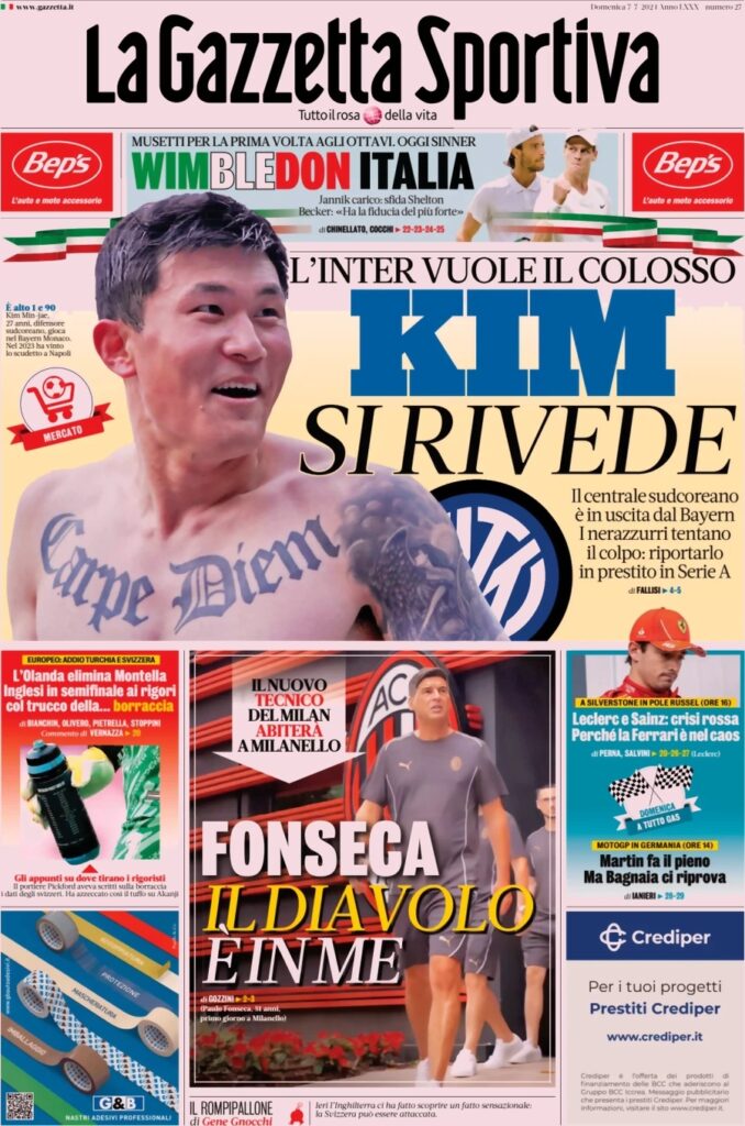 La Gazzetta dello Sport apre con il mercato dell’Inter: “Kim si rivede”. In basso: “Fonseca, il Diavolo è in me”. A lato: “L’Olanda elimina Montella. Inglesi in semifinale ai rigori col trucco della… borraccia”.
