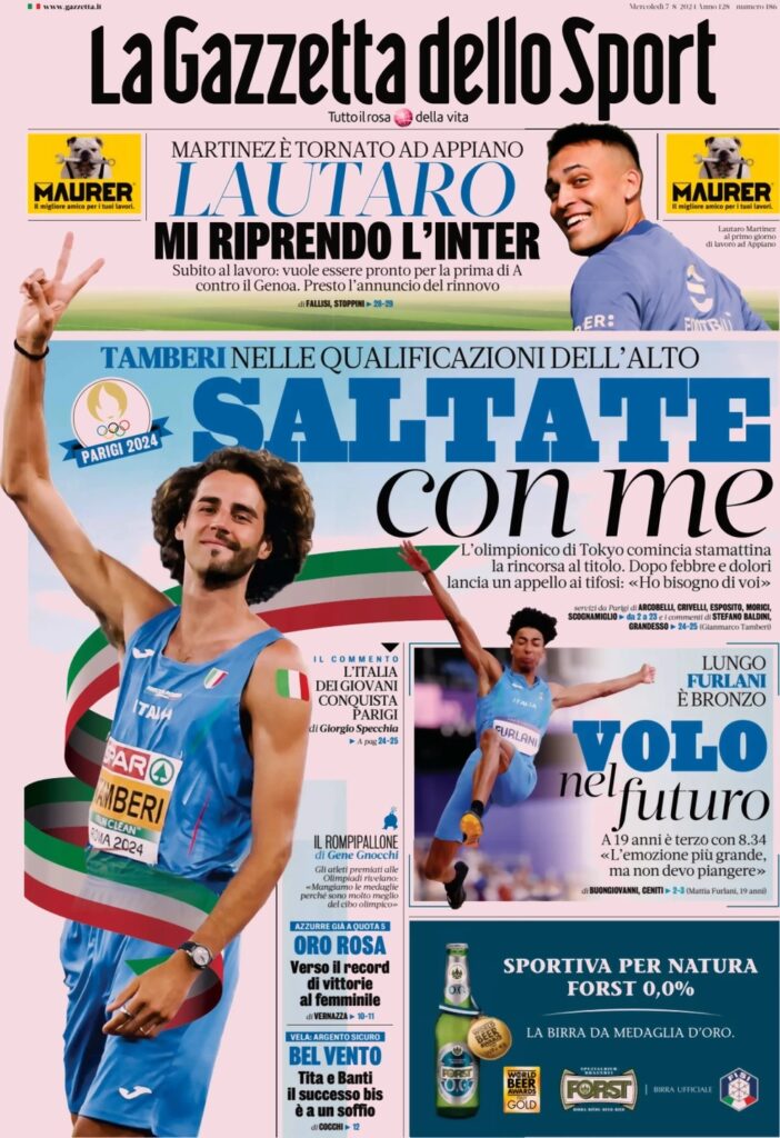 La Gazzetta dello Sport titola: “Saltate con me”. Sempre sulle olimpiadi spazio al bronzo di Furlani: “Volo nel futuro”. In taglio alto: “Lautaro: mi riprendo l’Inter”.