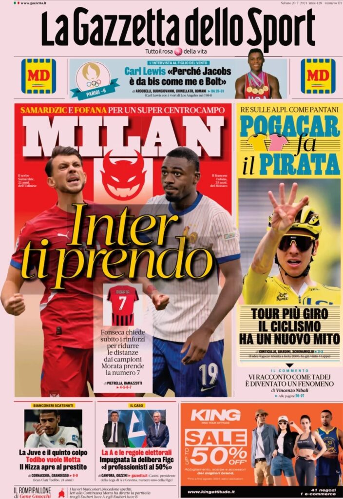 La Gazzetta dello Sport titola: “Milan, Inter ti prendo”. Sui bianconeri: “La Juve e il quinto colpo. Todibo vuole Motta. Il Nizza apre al prestito”. A lato spazio al ciclismo: “Pogacar fa il pirata”.
