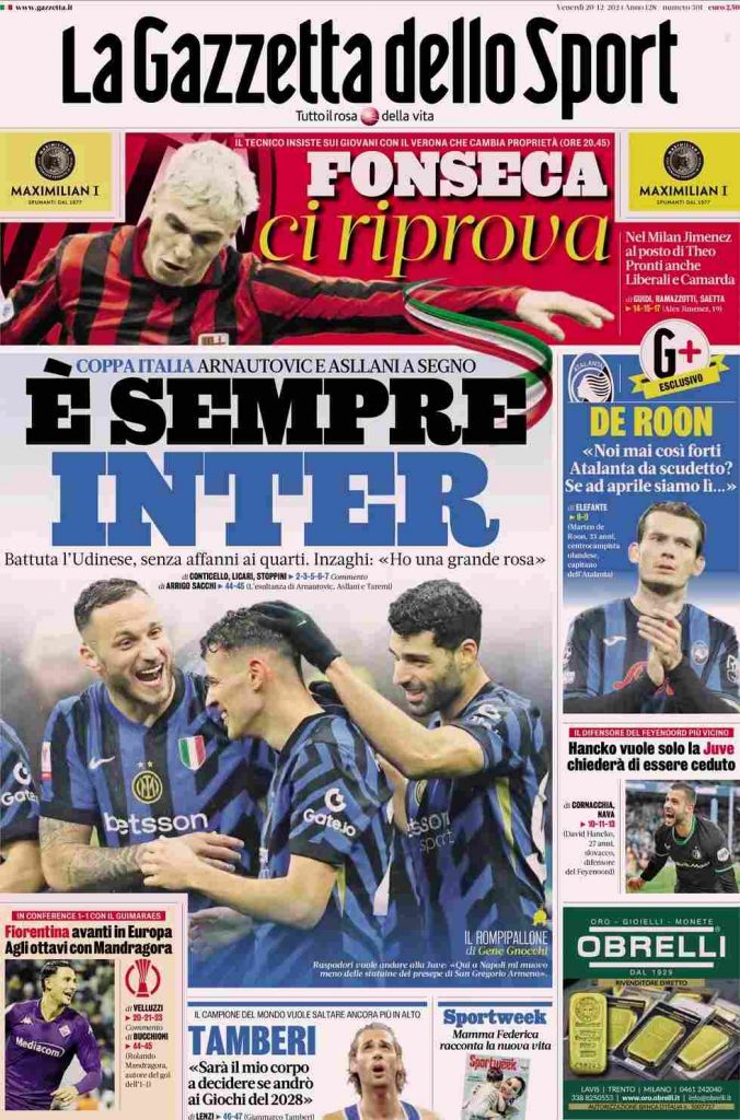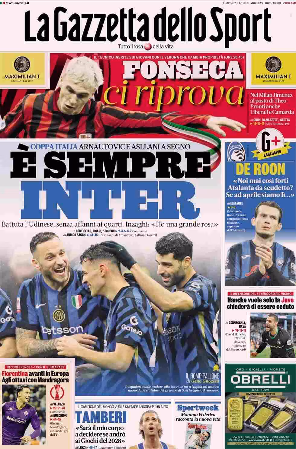 La Gazzetta dello Sport apre con la vittoria della squadra di Inzaghi in Coppa Italia: “È sempre Inter”. In taglio alto: “Fonseca ci riprova”. A lato spazio a un’intervista esclusiva a De Roon: “Noi mai così forti. Atalanta da Scudetto Se ad aprile siamo lì…”. Poi sulla Juve: “Hancko vuole la Juve, chiederà di essere ceduto”. In taglio basso: “Fiorentina avanti in Europa. Agli ottavi con Mandragora” e “Tamberi: Sarà il mio corpo a decidere se andrò ai Giochi del 2028”.