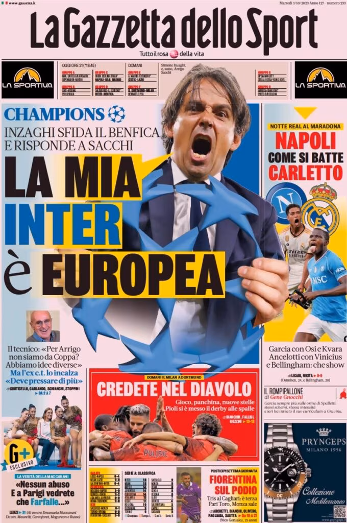 “La mia Inter è europea”, questo il titolo sulla prima pagina de La Gazzetta dello Sport che apre con le parole del tecnico nerazzurro. A lato spazio anche al Napoli che si prepara a sfidare il Real Madrid: “Napoli, come si batte Carletto”.