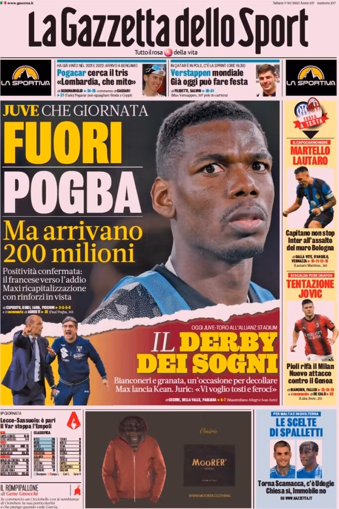 La Gazzetta dello Sport titola: “Juve, che giornata: Fuori Pogba ma arrivano 200 milioni”. Il riferimento è ai due grandi eventi successi ieri, ovvero alla positività confermata di Pogba e all’approvazione del bilancio 2022/23 con maxi ricapitolazione per la società. Spazio anche al match contro il Torino: “Il derby dei sogni”.