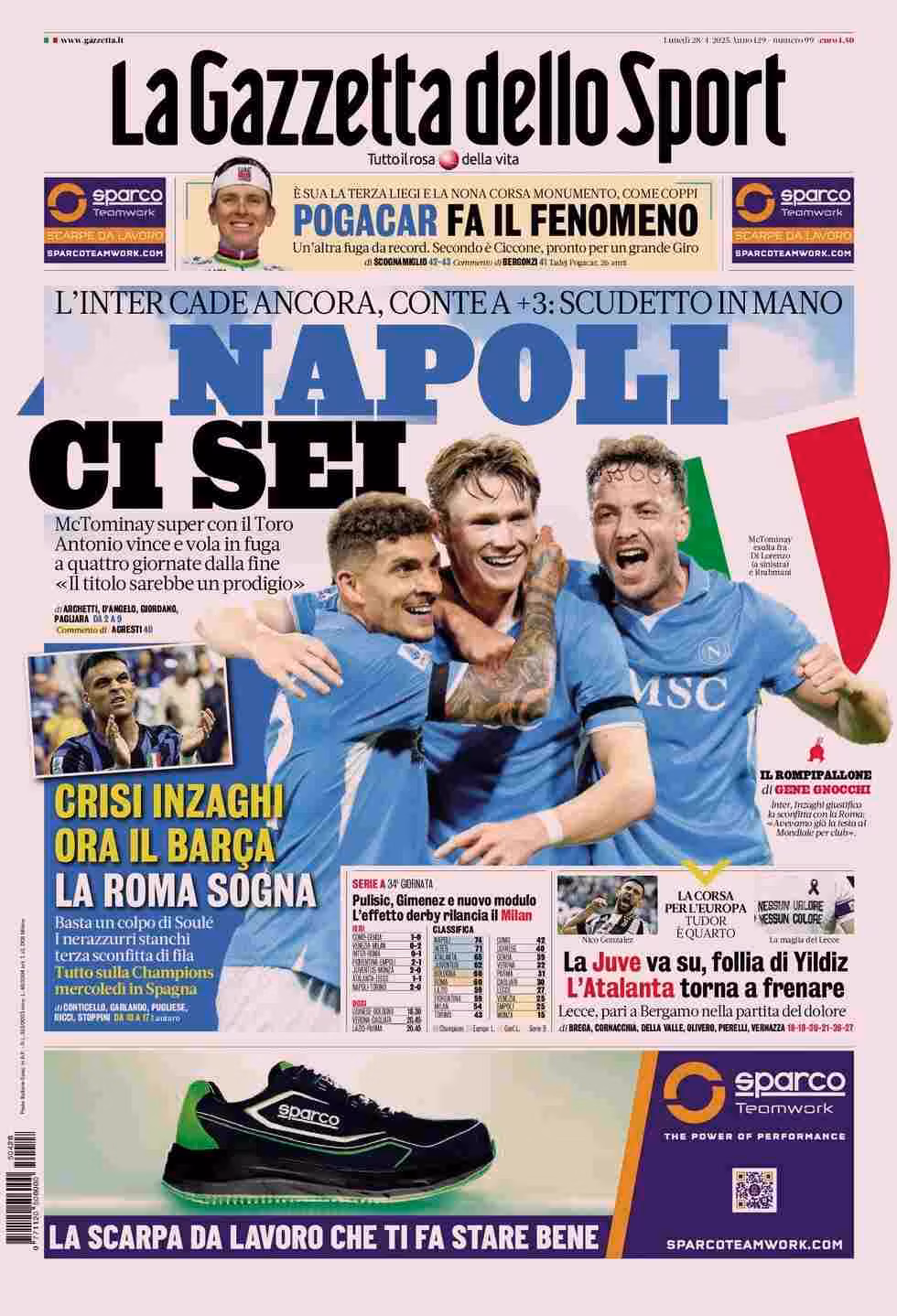 La Gazzetta dello Sport titola: “Napoli ci sei. L’Inter cade ancora, conte a +3: scudetto in mano”. In alto: “Pogacar fa il fenomeno”. In taglio basso: “Crisi Inzaghi, ora il Barca. La Roma sogna”, “Pulisic, Gimenez e nuovo modulo. L’effetto derby rilancia il Milan” e “La Juve va su, follia di Yildiz. L’Atalanta torna a frenare“.