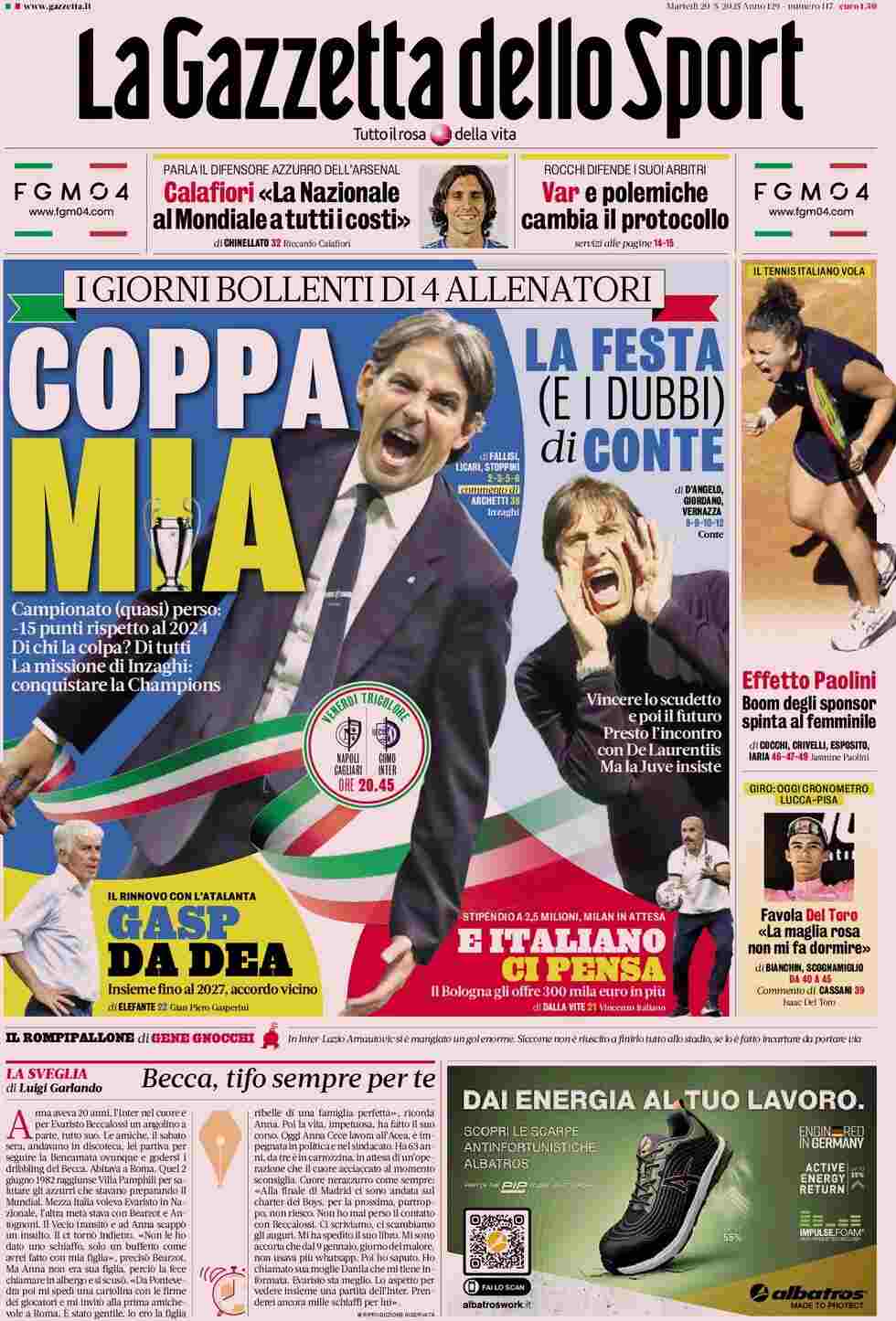 La Gazzetta dello Sport titola: “Coppa mia”. E ancora: “I giorni bollenti di 4 allenatori”, “La festa (e i dubbi) di Conte“, “Gasp da Dea” e “E italiano ci pensa”. In alto: “Calafiori: La Nazionale al Mondiale a tutti i costi” e “Var e polemiche, cambia il protocollo”. A lato: “Effetto Paolini: Boom degli sponsor spinta al femminile” e “Favola Del Toro: La maglia rosa non mi fa dormire”.