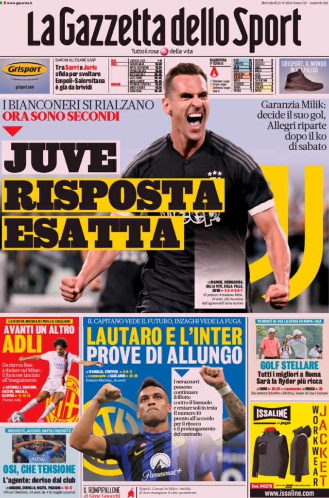 Nell’edizione odierna La Gazzetta dello Sport titola: “Juve, risposta esatta”. E poi ancora: “I bianconeri si rialzano, ora sono secondi. Garanzia Milik: decide il suo gol, Allegri riparte dopo il ko di sabato”. Sull’Inter: “Lautaro e l’Inter, prove di allungo”.