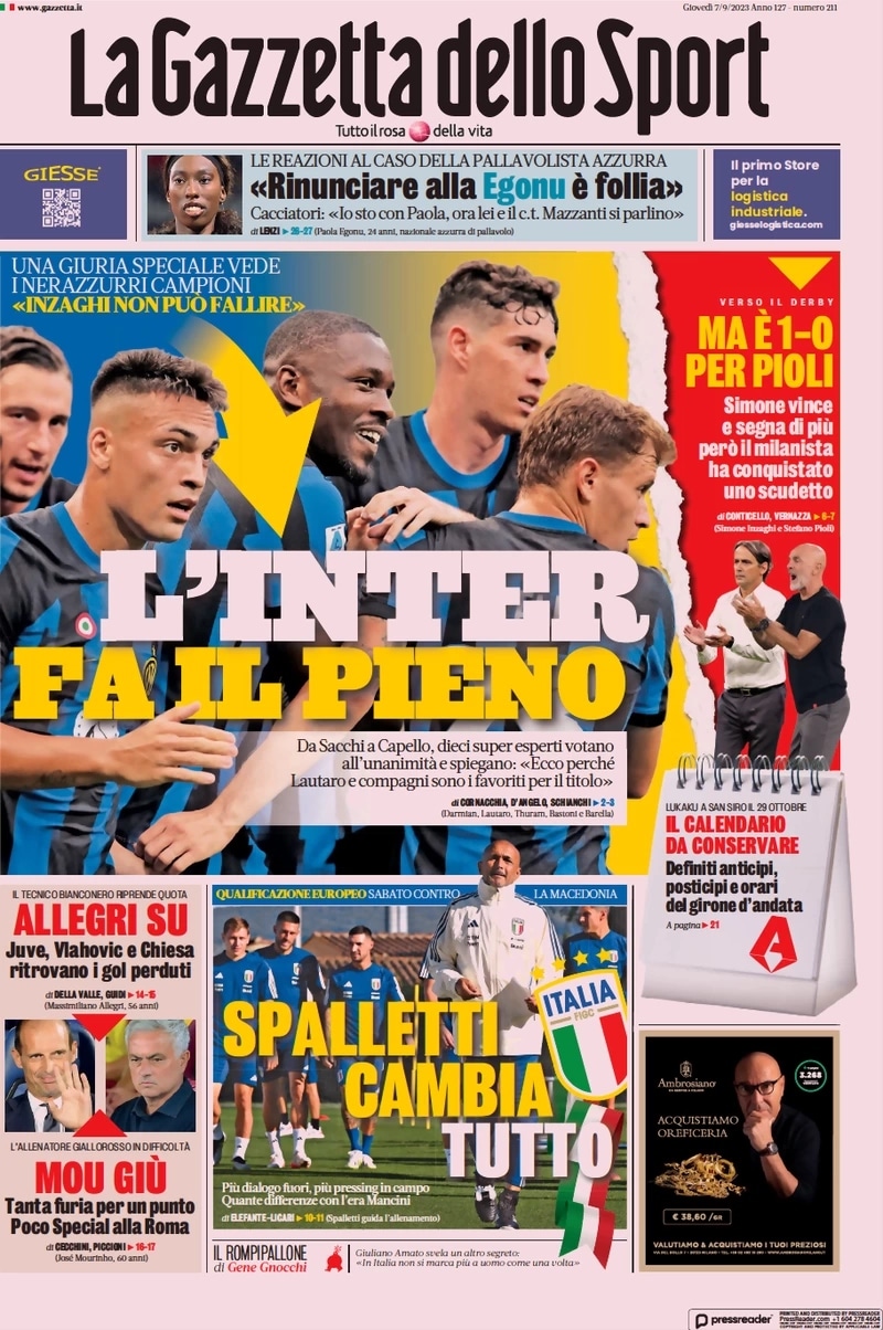L’argomento della prima pagina de La Gazzetta dello Sport è il derby della Madonnina tra Inter e Milan in programma di ritorno dalla pausa nazionali: “L’Inter fa il pieno”. In taglio basso spazio anche ai bianconeri: “Allegri su. Juve, Vlahovic e Chiesa ritrovano i gol perduti. Mou giù. Tanta furia per un punto. Poco Special alla Roma”.