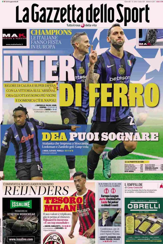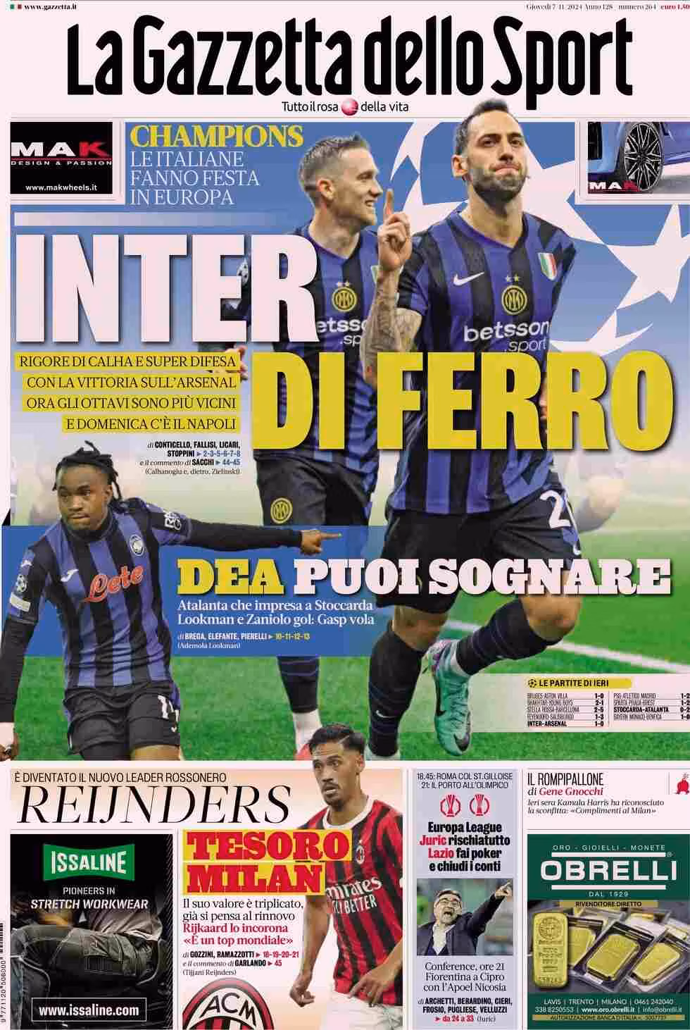 La Gazzetta dello Sport apre con i nerazzurri di Inzaghi in Champions League: “Inter di ferro”. Vittoria anche per l’Atalanta: “Dea puoi sognare”. In alto: “Champions, le italiane fanno festa in Europa”. In taglio basso: “Reijnders, tesoro Milan” e “Europa League. Juric rischiatutto. Lazio fai poker e chiudi i conti. Conference, ore 21. Fiorentina a Cipro con l’Apoel Nicosia”.