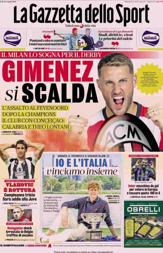 La Gazzetta dello Sport apre con il mercato del Milan: “Gimenez si scalda. Il Milan lo sogna per il derby”. In basso: “Vlahovic è rottura. Compleanno triste. Sarà addio alla Juve”, “Io e l’Italia vinciamo insieme”, “Inter macchina da gol per volare in Europa e toccare quota 100 in A” e “Nainggolan shock. Arrestato in Belgio: traffico di cocaina”.