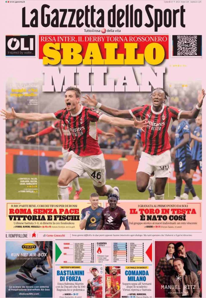 La Gazzetta dello Sport apre con la vittoria dei rossoneri nel derby della Madonnina: “Sballo Milan”. In basso: “Roma senza pace. Vittoria e fischi” e “Il Toro in testa è nato così”. E poi ancora spazio a MotoGp e basket: “Bastianini di forza” e “Comanda Milano”.