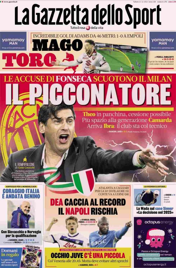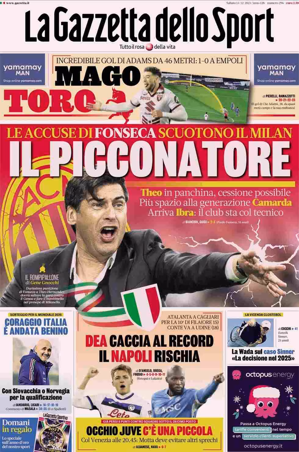 La Gazzetta dello Sport apre con il Milan: “Il picconatore. Le accuse di Fonseca scuotono il Milan”. In alto: “Mago Toro”. In taglio basso: “Coraggio Italia è andata benino. Con Slovacchia e Norvegia per la qualificazione”, “Dea caccia al Record. Il Napoli rischia”, “Occhio Juve c’è una piccola” e “La WADA sul caso Sinner: La decisione nel 2025”.