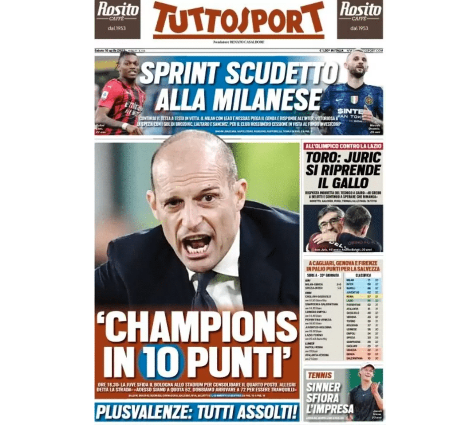 Allegri ha detto in conferenza che sono 10 i punti che mancano alla Champions League, ma anche che i giocatori dovranno fare tutto il possibile per far bottino pieno. Per questa sera il tecnico ha alcuni problemi a centrocampo, con i soli Zakaria e Rabiot disponibili.