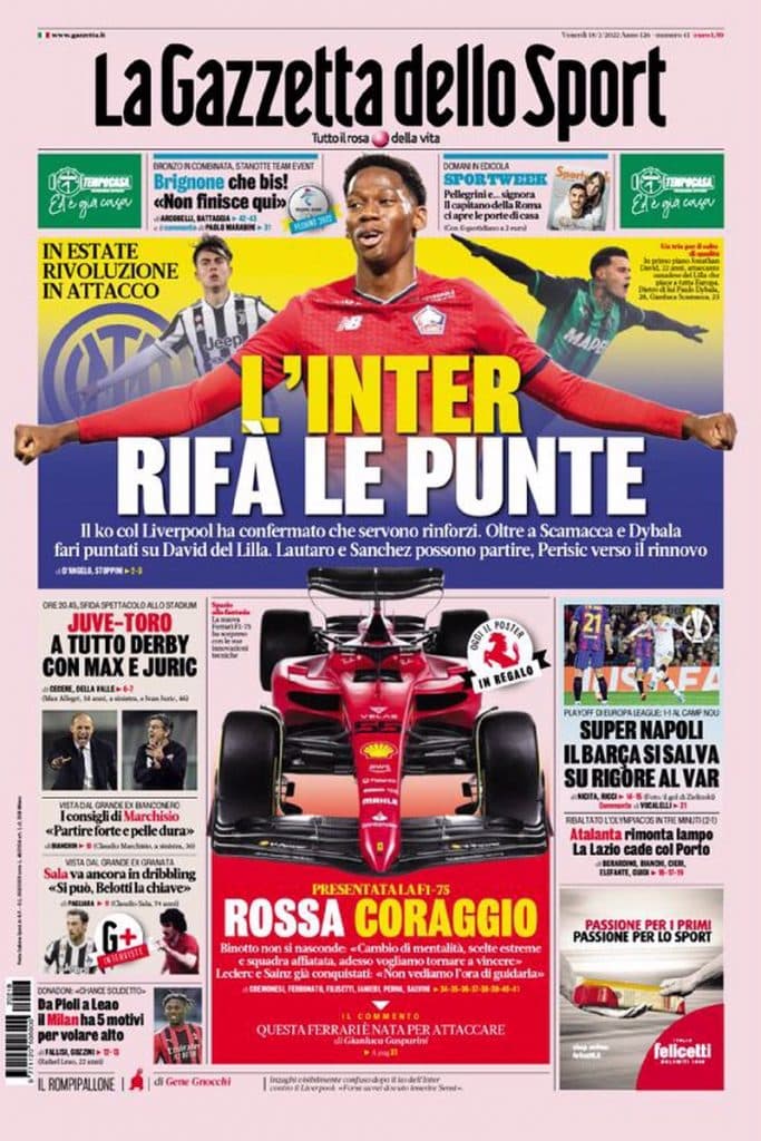 La prima pagina de La Gazzetta dello Sport sottolinea come l’Inter sia pronta a fare un’offerta di contratto importante per Paulo Dybala in caso di rottura contro la Juventus. L’argentino, infatti, ancora non ha rinnovato il contratto con i bianconeri in scadenza a fine stagione ed ogni giorno che passa sarebbe sempre più lontano da Torino anche perché di recente incontri con Antun, suo agente, non ci sono stati. Come detto a più riprese dall’amministratore delegato, Maurizio Arrivabene, Dybala si deve guadagnare il rinnovo di contratto sul campo e, in caso le prestazioni del numero dieci non soddisfino la dirigenza, arriverà la cessione a parametro zero.
