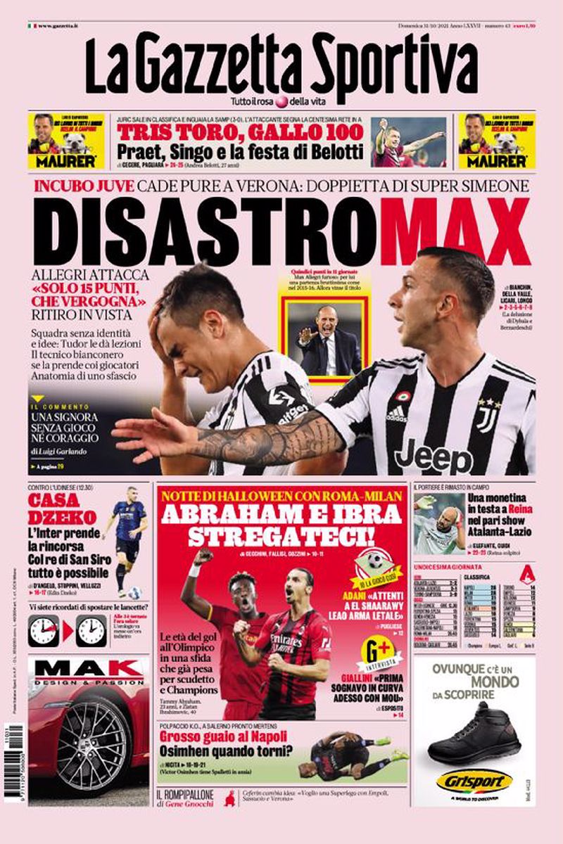 Ennesima partita-disastro per Massimiliano Allegri che ha sbagliato l’ennesima formazione iniziale e ha fatto svegliare la Vecchia Signora solamente negli ultimi 10 minuti di gioco, che ovviamente non sono bastati per pareggiare una partita che meritava di vincere ampiamente la squadra di Tudor.