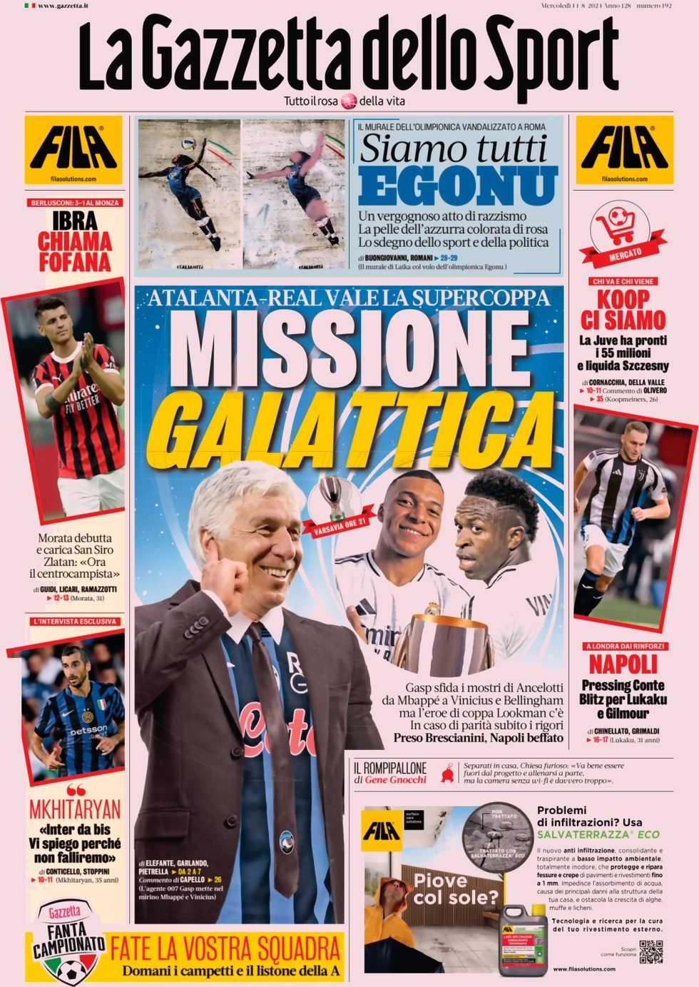 La Gazzetta dello Sport apre con la sfida di Supercoppa europea dell’Atalanta: “Missione galattica”. In alto: “Siamo tutti Egonu”. A lato: “Ibra chiama Fofana”, “Mkhitaryan: Inter da bis. Vi spiego perchè non falliremo”, “Koop ci siamo” e “Napoli. Pressing Cnote. Blitz per Lukaku e Gilmour”.