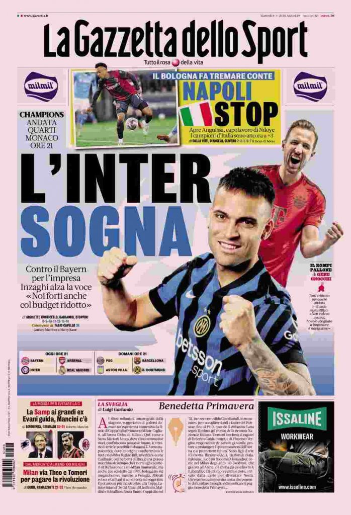 La Gazzetta dello Sport titola: “L’Inter sogna”. Il riferimento al quarto di finale di andata di Champions League dei nerazzurri contro il Bayern Monaco. In taglio alto spazio alla Serie A: “Napoli stop. Il Bologna fa tremare Conte”. In basso: “La Samp ai grandi ex. Evani guida, Mancini c’è” e “Milan, via Theo e Tomori per pagare la rivoluzione”.