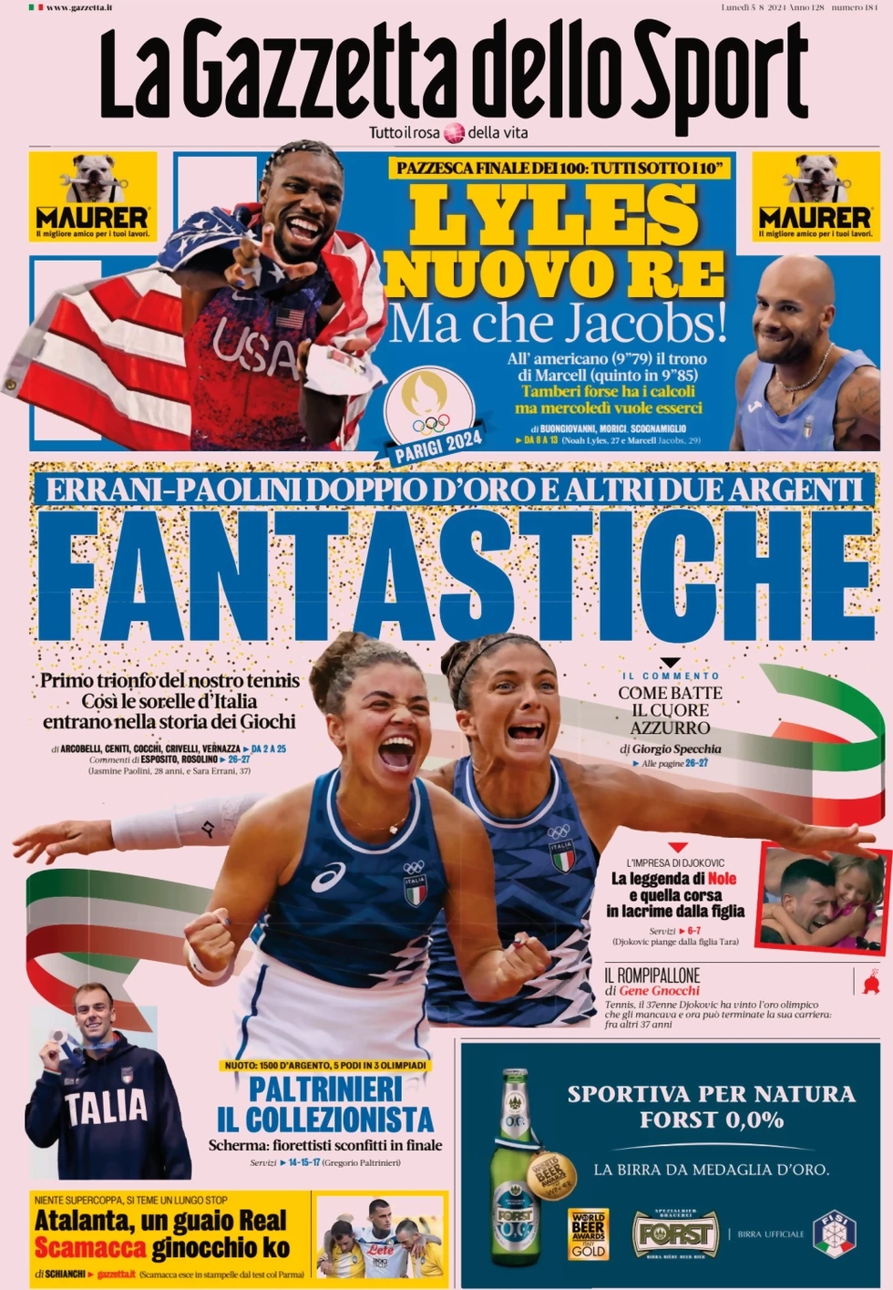 La Gazzetta dello Sport apre con la vittoria di Errani-Paolini Olimpiadi: “Fantastiche”. In alto: “Lyles nuovo re”. In taglio basso: “Paltrinieri il collezionista” e “Atalanta, un guaio Real. Scamacca ginocchio ko”.
