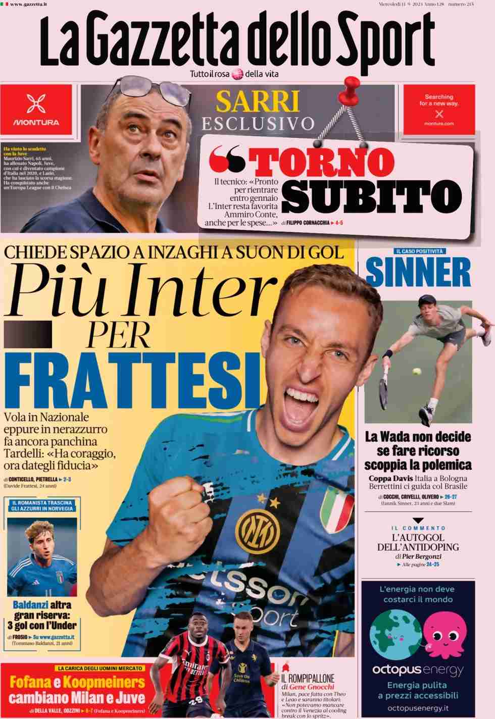 La Gazzetta dello Sport titola: “Più Inter per Frattesi”. In taglio alto spazio a un’intervista esclusiva a Sarri: “Torno subito”. A lato: “Sinner. La Wada non decide se fare ricorso, scoppia la polemica”. In taglio basso: “Baldanzi altra gran riserva: 3 gol con l’Under” e “Fofana e Koopmeiners cambiano Milano e Juve“.